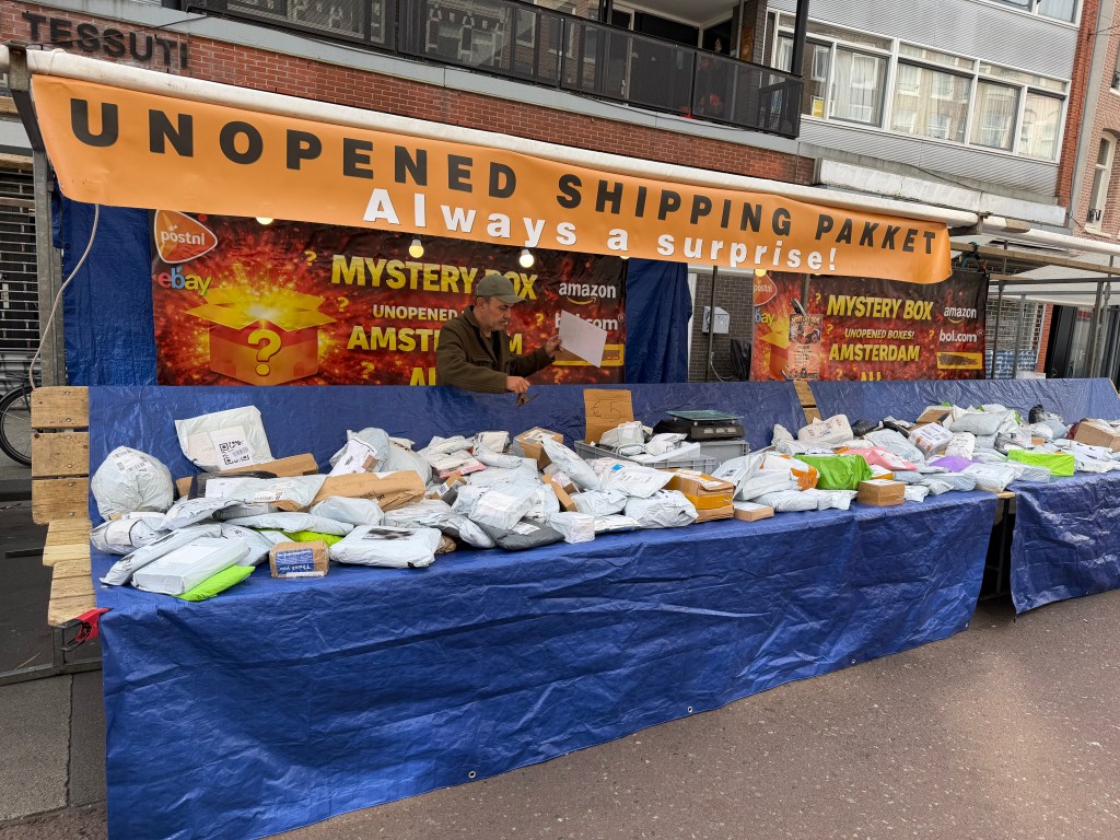 We went quite a distance before we found a street with some vendors. One of the Konnigsdag traditions is for people to bring out their own personal possessions that they want to get rid of; the entire country is one giant flea market. As one of our tour guides said, “People sell their junk and then buy somebody else’s junk”. The street we were on had actual stores who moved their items out onto the street. We ended up buying a few things, including some packages of certified-for-import-to-the-US tulip bulbs for people back home. This was a good thing, because the flower market was closed, and I wasn’t sure where else we’d be able to buy bulbs.