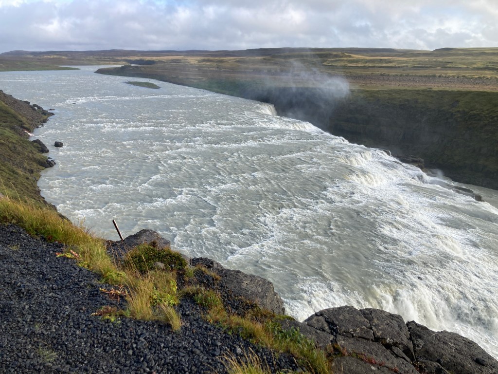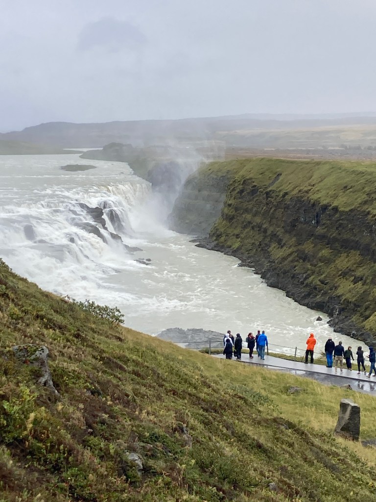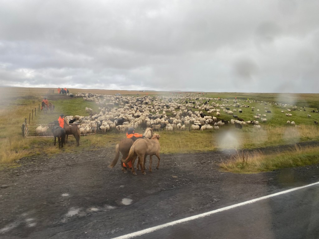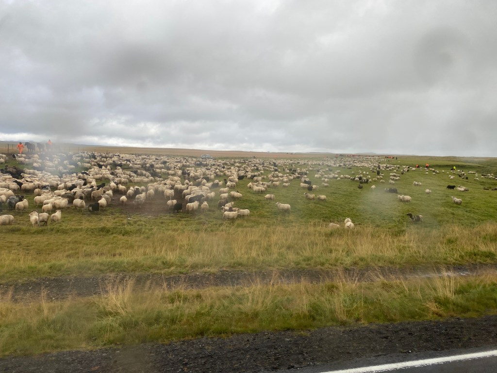 Onward to our next stop on the Golden Circle: the Gullfoss waterfall. As luck would have it, our bus passed by a massive sheep round-up, as sheep farmers begin the process of bringing their flocks to winter pastures. This is a communal thing – groups of farmers bring all their sheep at the same time.